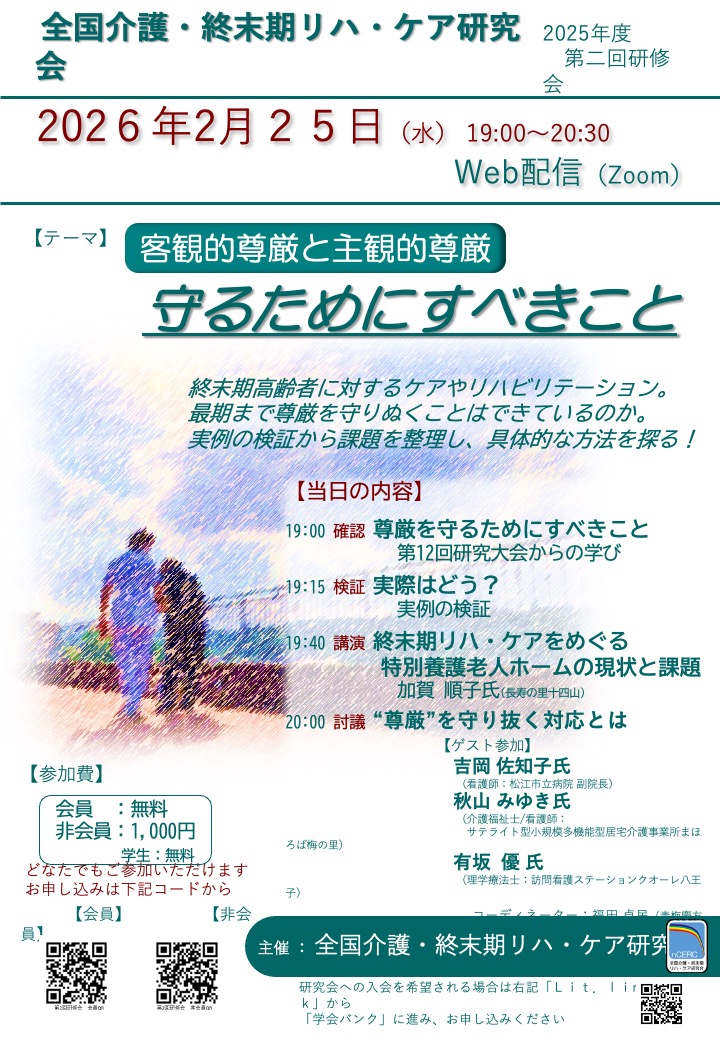 本研修会は、昨年開催した「第12回研究大会(9/28)」と「第一回研修会(12/4)」を総括し、2026~2028年度の研究大会につなげる会です。 終末期高齢者を対象としたケアやリハビリテーションについて、広く、深く考える機会となるよう進めてまいります。ご参加ください。